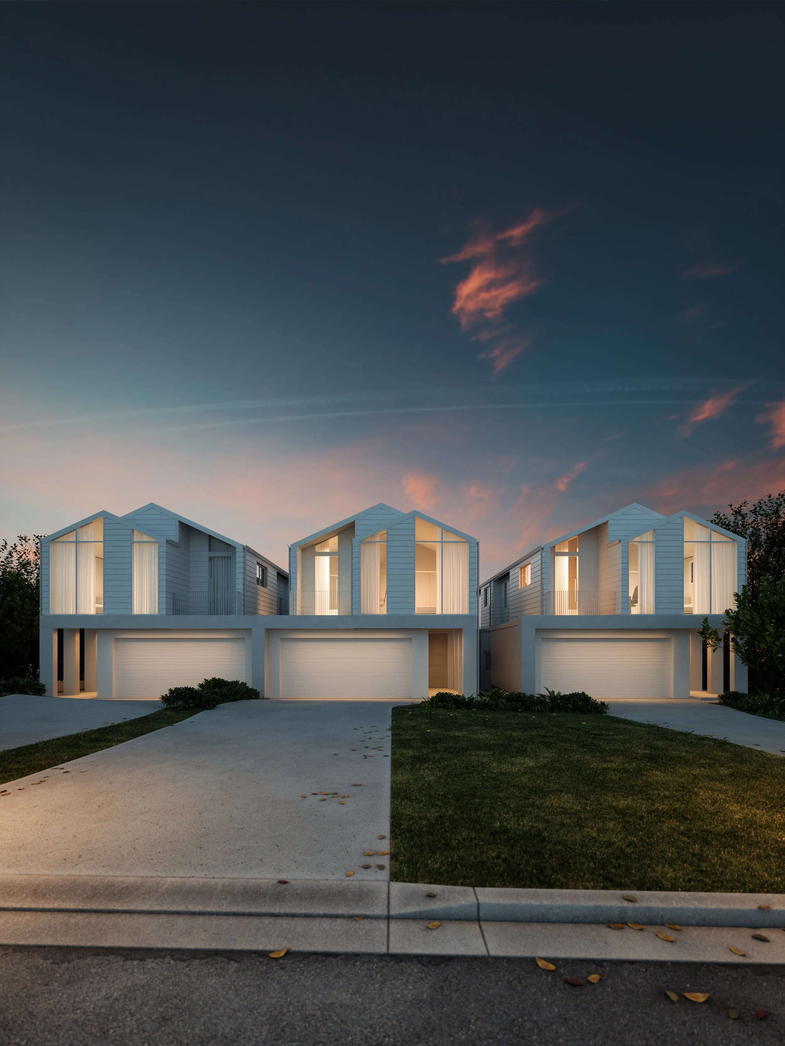 This new block of townhouses in the beautiful coastal town of Port Macquarie, designed for elegant coastal living was filled with natural northern light thanks to the high raked ceilings on the upper level.