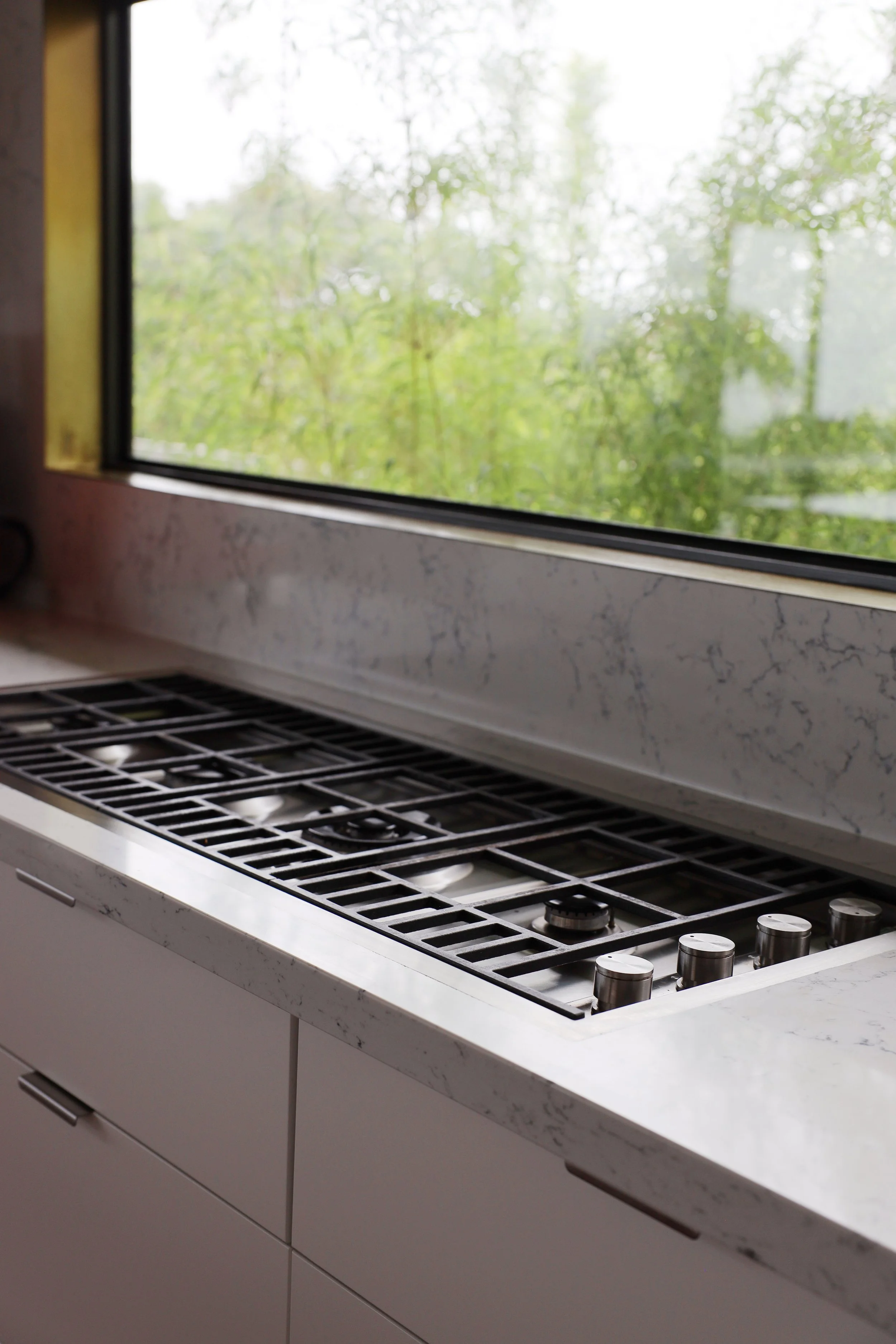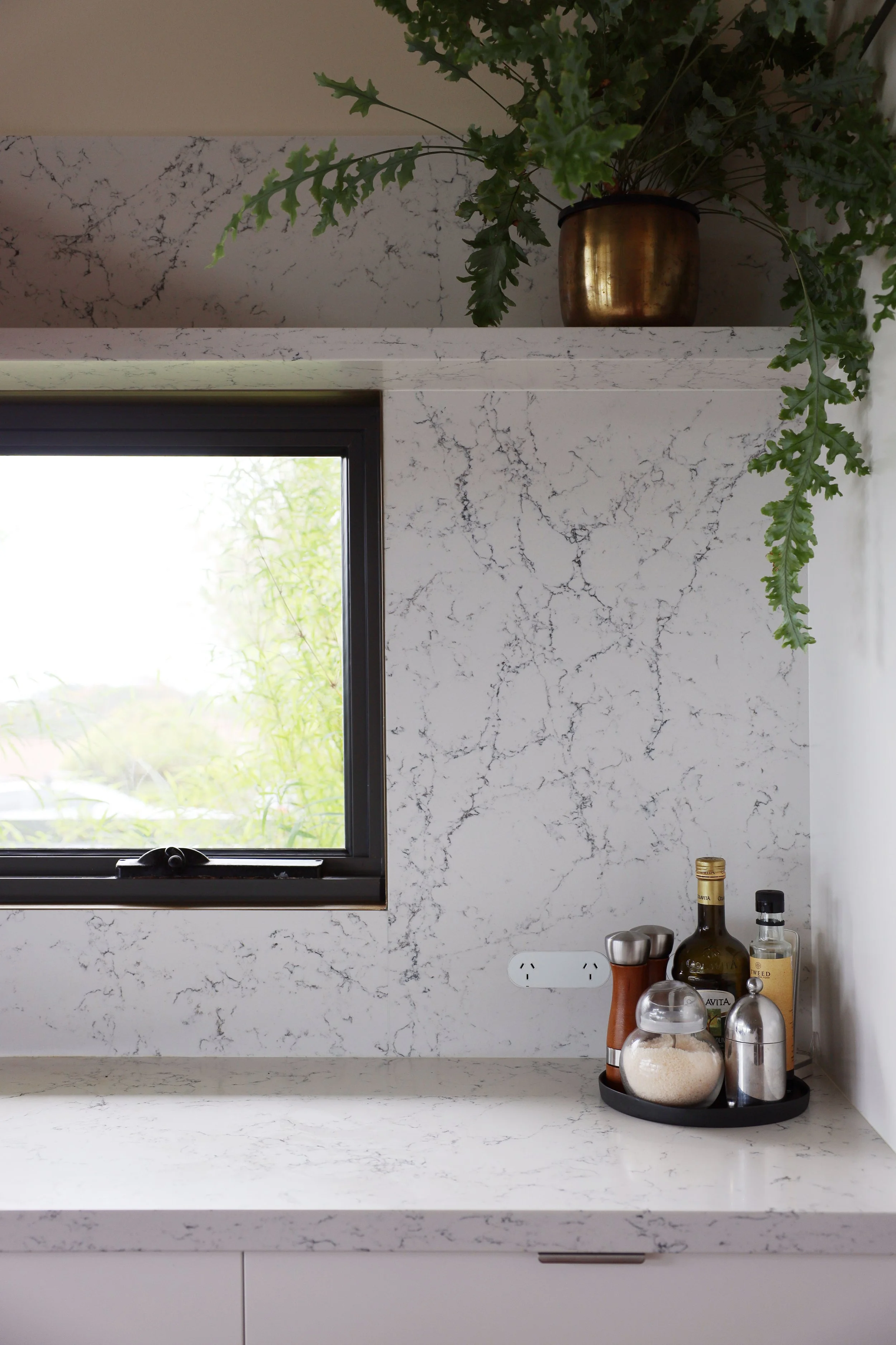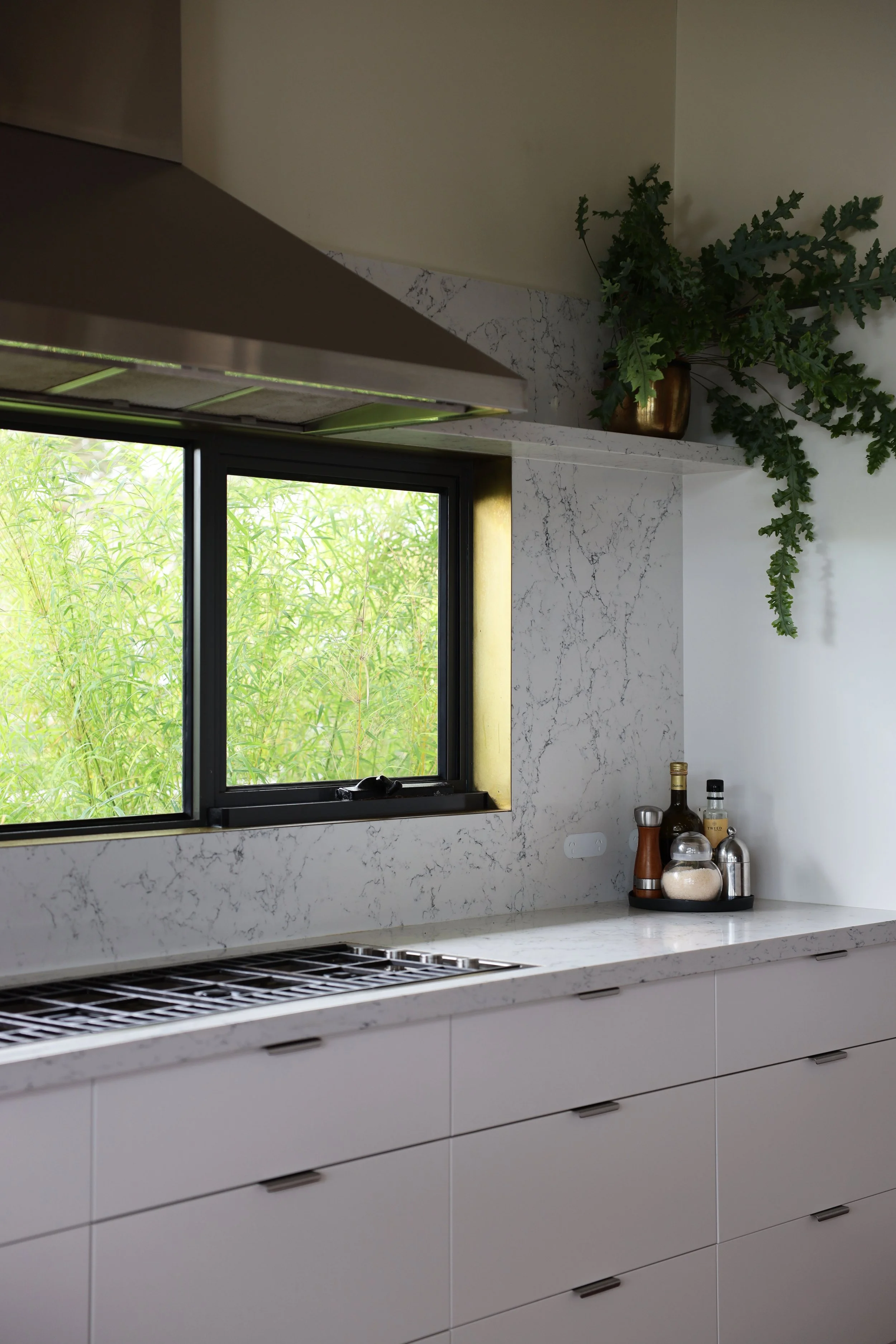 New stone bench tops, Dulux natural white painted doors and panels, Lo & Co handles, Zetr power points, new flush mounted Italian appliances, and a brass cladd window sill that will darken and patina over the years.