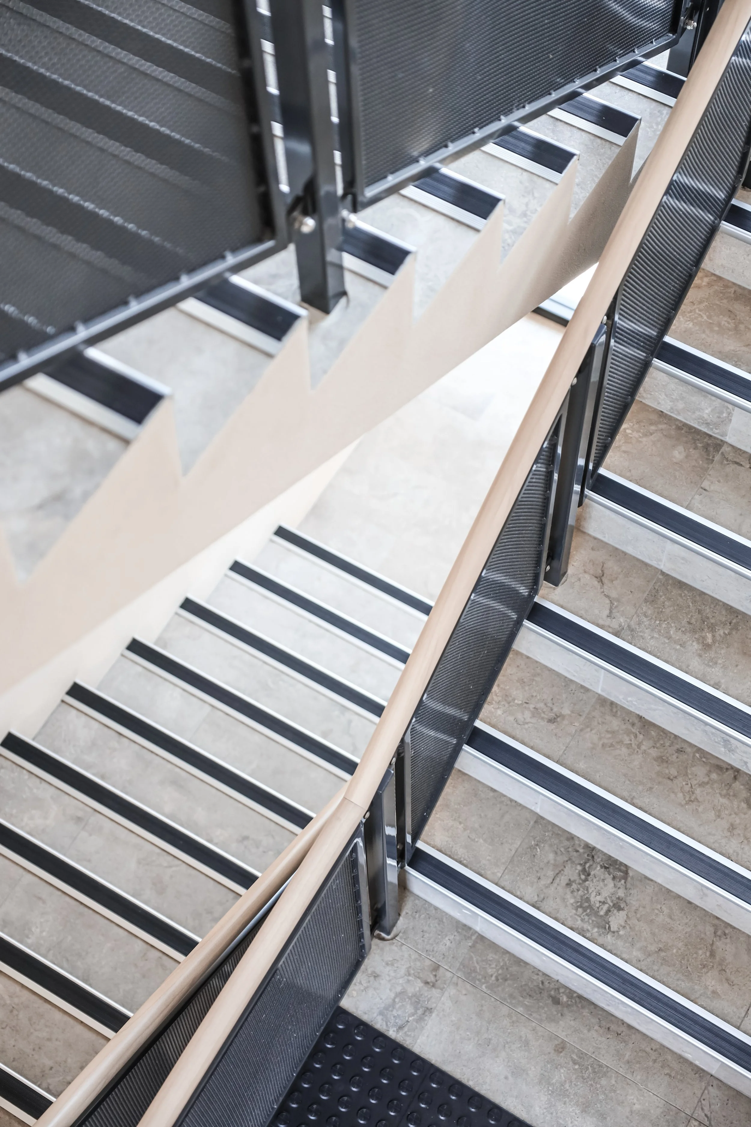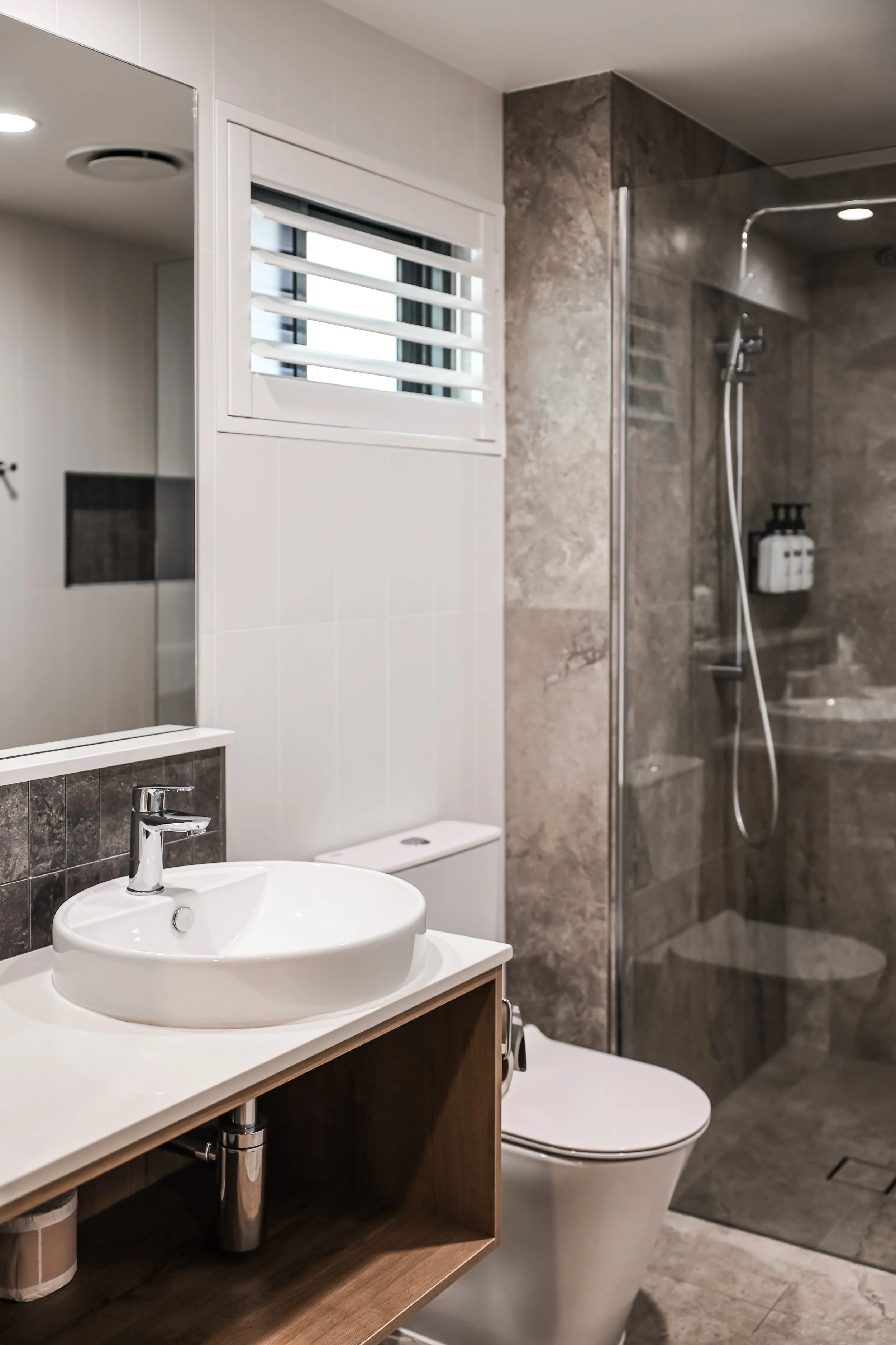 Working with the original colour pallet, we selected finishes designed to transition across to the old building over time. Adding texture to the exterior with aluminium timber battening, soft white stone wall cladding, and perforated aluminium balustrade to allow light to flood the southern orientated entry corridors- the new building has a fresh vibe that harmonises beautifully with the existing.