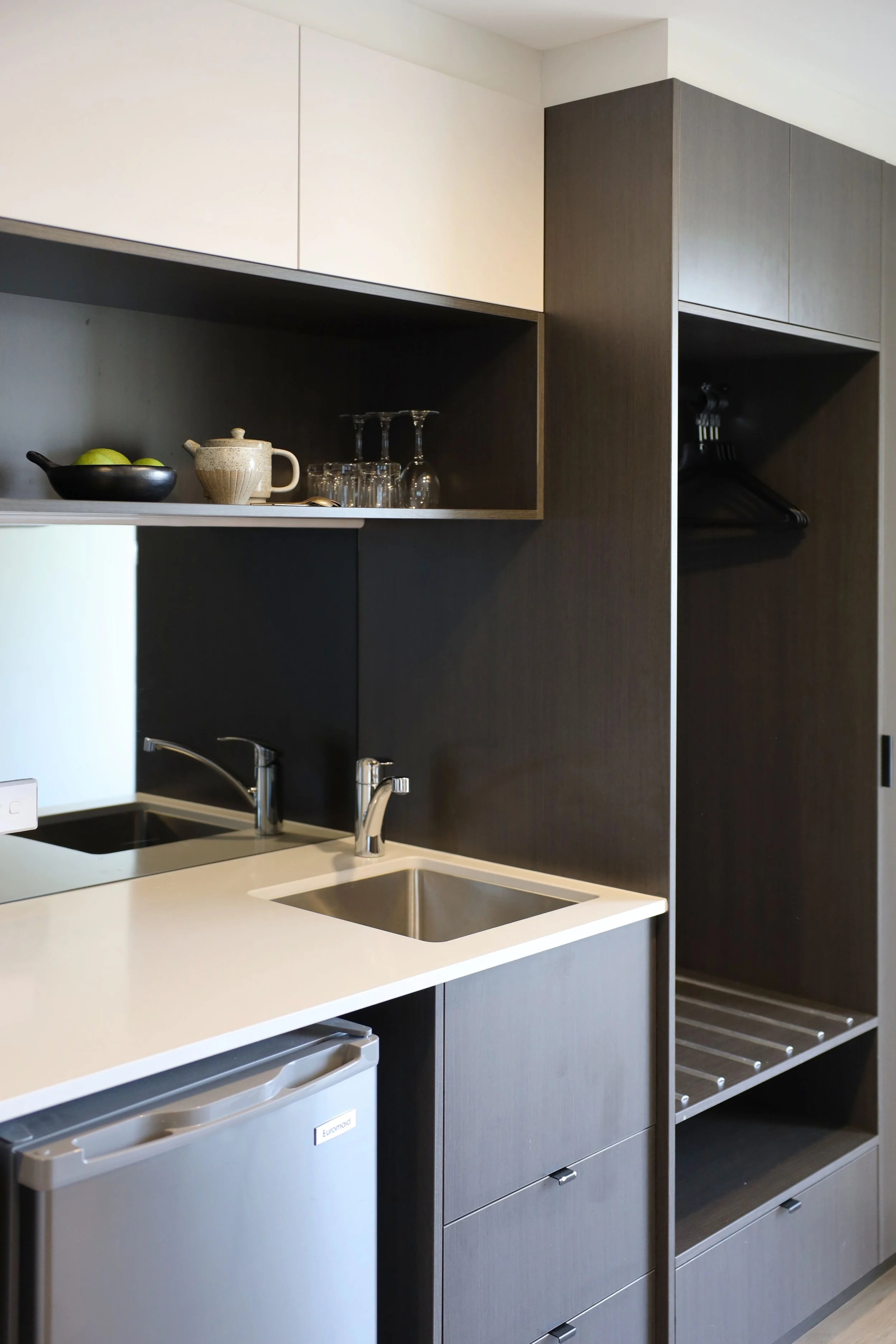 Using easy clean resilient finishes, acoustic timber flooring paired with warm white walls and a dark luxurious kitchenette and robe with smoked glass splashback, the spaces will feel relaxed and luxurious. The furniture has been custom designed by the Linnea team, featuring soft oak timber, Carrara marble, and luxurious rugs and commercial fabrics.
